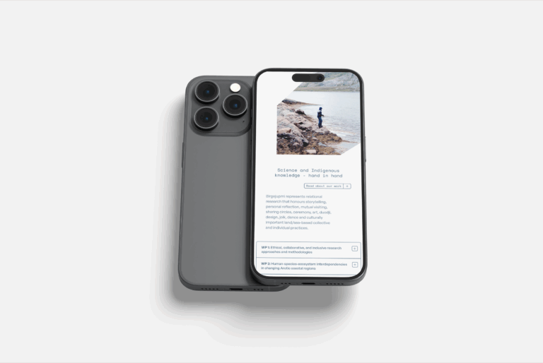 Vi har utviklet prosjektets visuelle identitet i tett samarbeid med forskningsmiljøer, urfolksorganisasjoner og lokale aktører i både Sápmi og Kalaallit Nunaat. Logoen består av tre fjellformasjoner – to fra kystområder i Sápmi og ett fra Grønland – som til sammen representerer både den geografiske forankringen og prosjektets tematiske helhet. Fjellene fungerer som visuelle symboler på kunnskap, tilhørighet og langsiktighet, og understreker prosjektets ambisjon om å koble tradisjonell og vitenskapelig kunnskap.